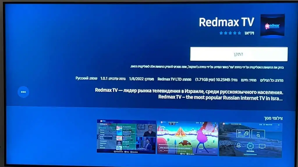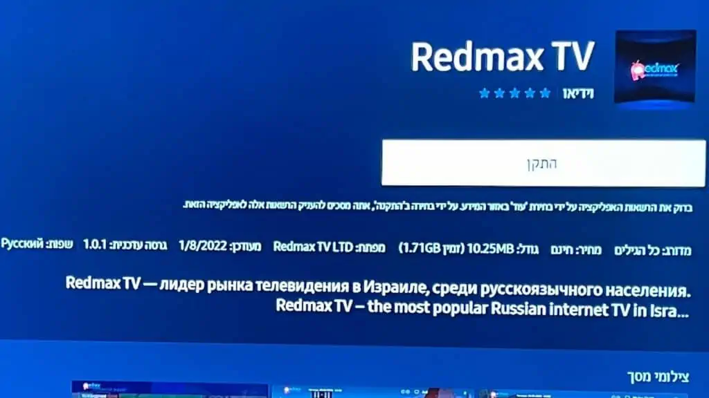 Выбираем иконку приложения “Redmax TV” и Вас сразу перебрасывает в магазин приложений Samsung. После чего Вам необходимо нажать кнопку “Установить”. После чего приложение начнет свою загрузку и установку на телевизор ( Если же у Вас выскочила табличка, что необходимо зайти в аккаунт Samsung тогда перейдите к пункту 1.1 ).