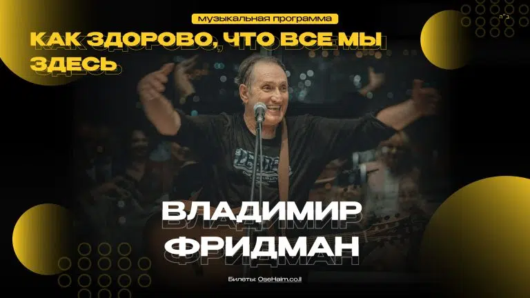 Владимир Фридман — популярный актёр театра и кино, лауреат премии «Человек Года» в 2004 и 2019 годах, а также премии «Лучший актёр года» в израильском театре в 2006 году. В 2023 году он был удостоен премии Министерства Алии и Интеграции за выдающийся вклад в израильское общество в категории «Искусство». В программе прозвучат любимые песни и мелодии, а также авторские произведения, исполненные с присущей артисту харизмой и теплотой. Не упустите возможность насладиться вечером живой музыки и душевного общения с Владимиром Фридманом. Музыкальная программа пройдет 5 июня в Хайфе, 16 июня в Хадере, 20 июля в Бер-Шеве и 14 августа в Кирьят-Гате.